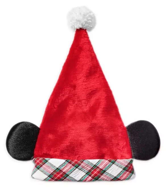Make merry this Christmas when wearing our Mickey Mouse Santa Hat. This adjustable red plush stocking cap with black plush Mickey ears features a plaid flannel cuff and white plush pom pom.